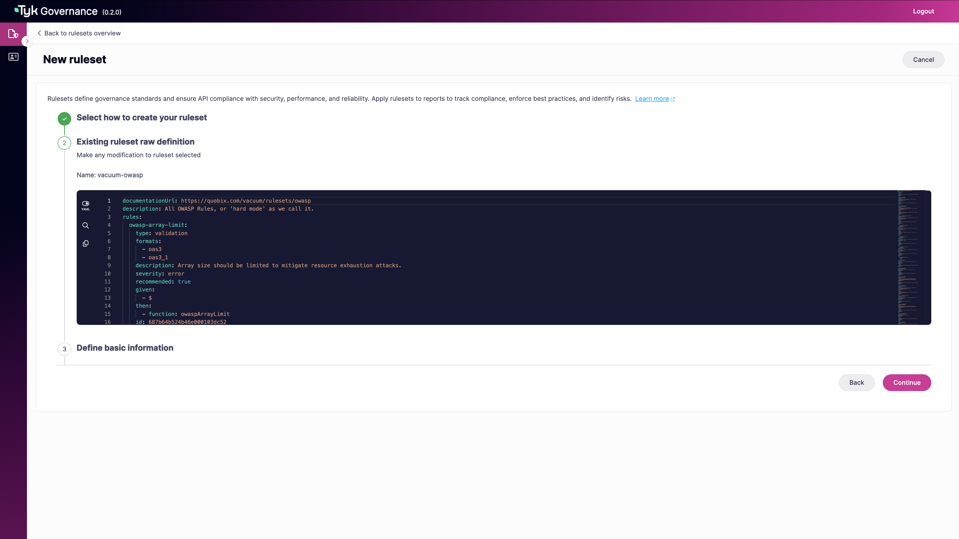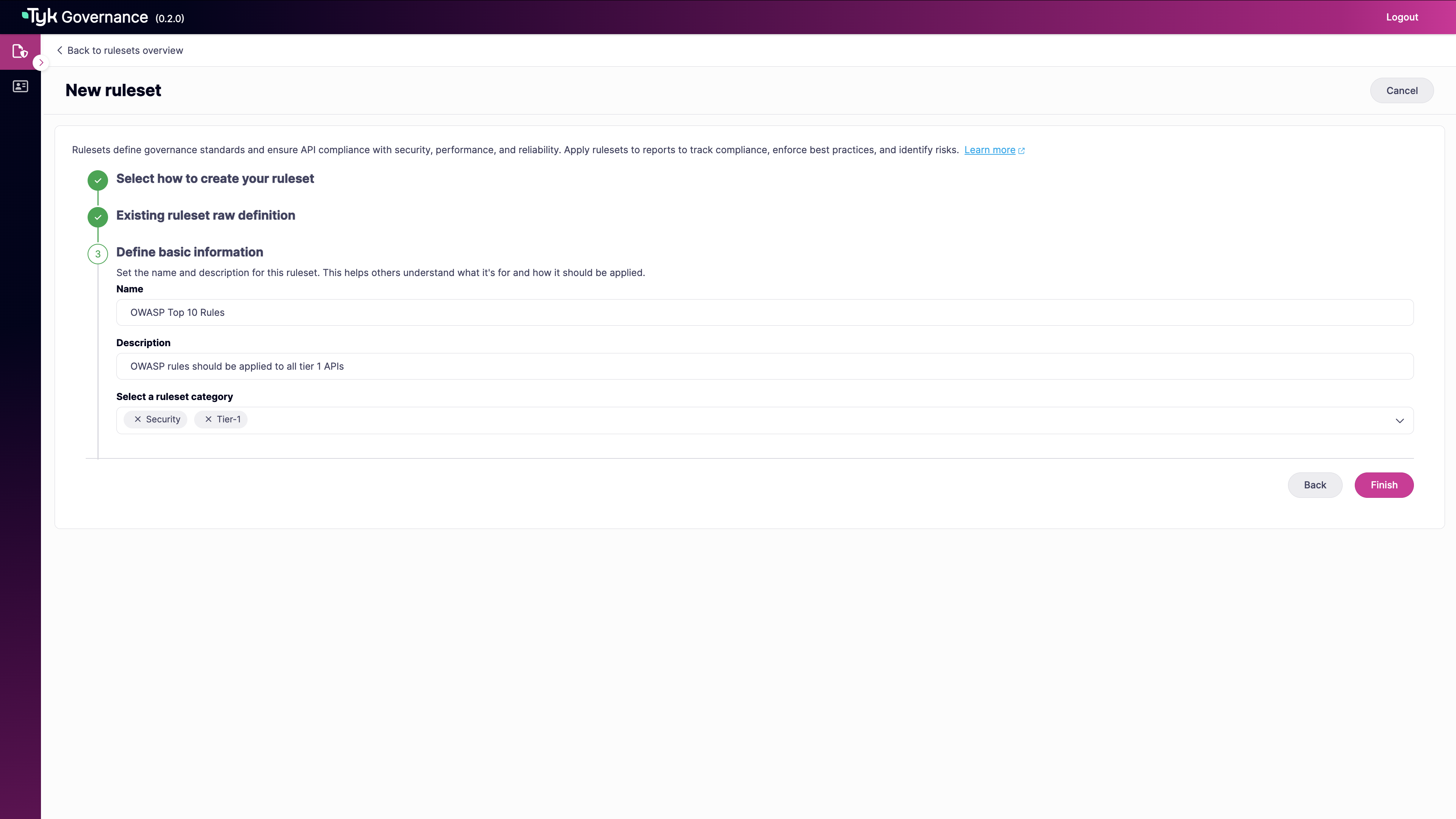 1. Access the Rulesets Section Navigate to the Rulesets section in your Tyk Governance dashboard.