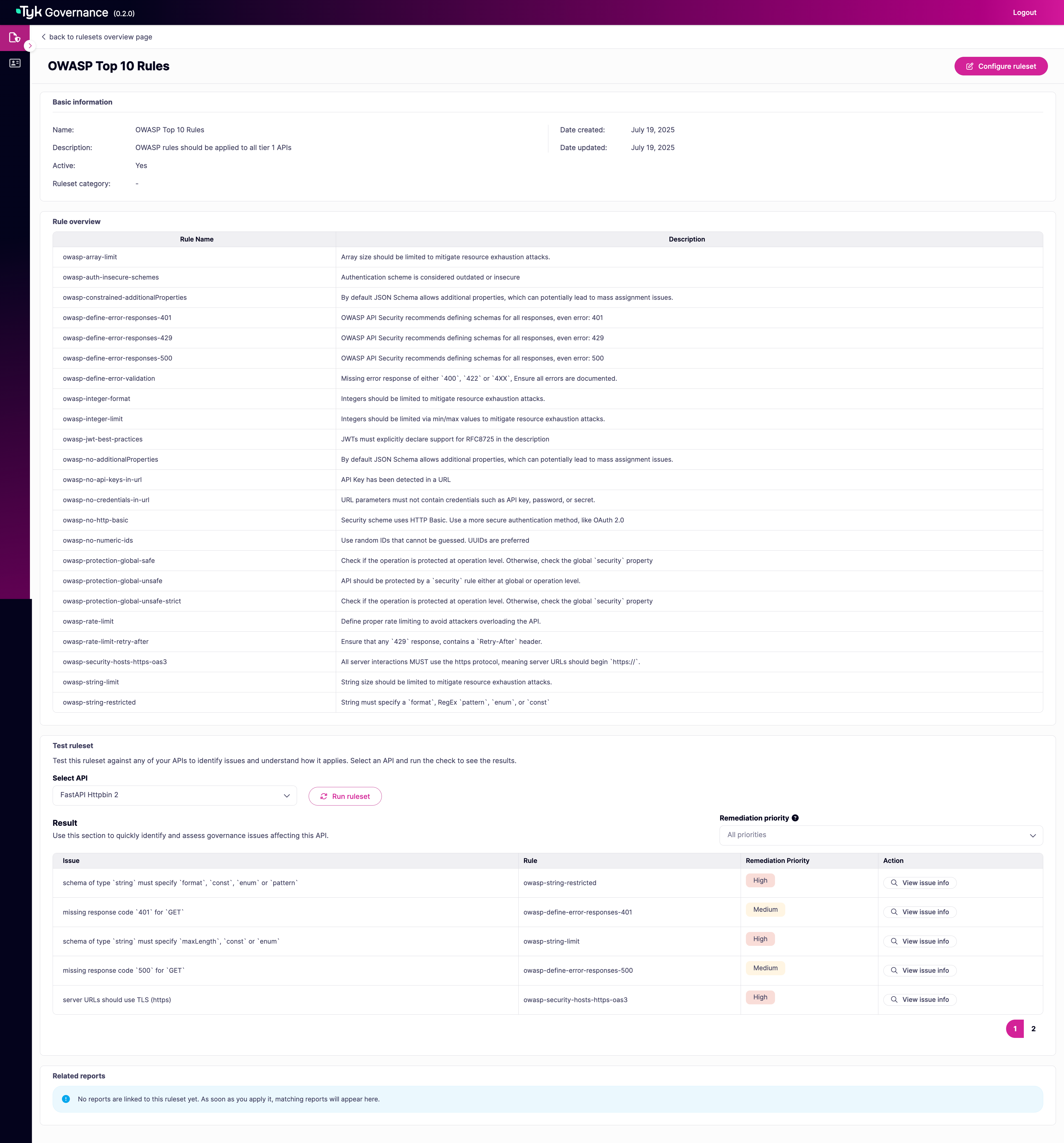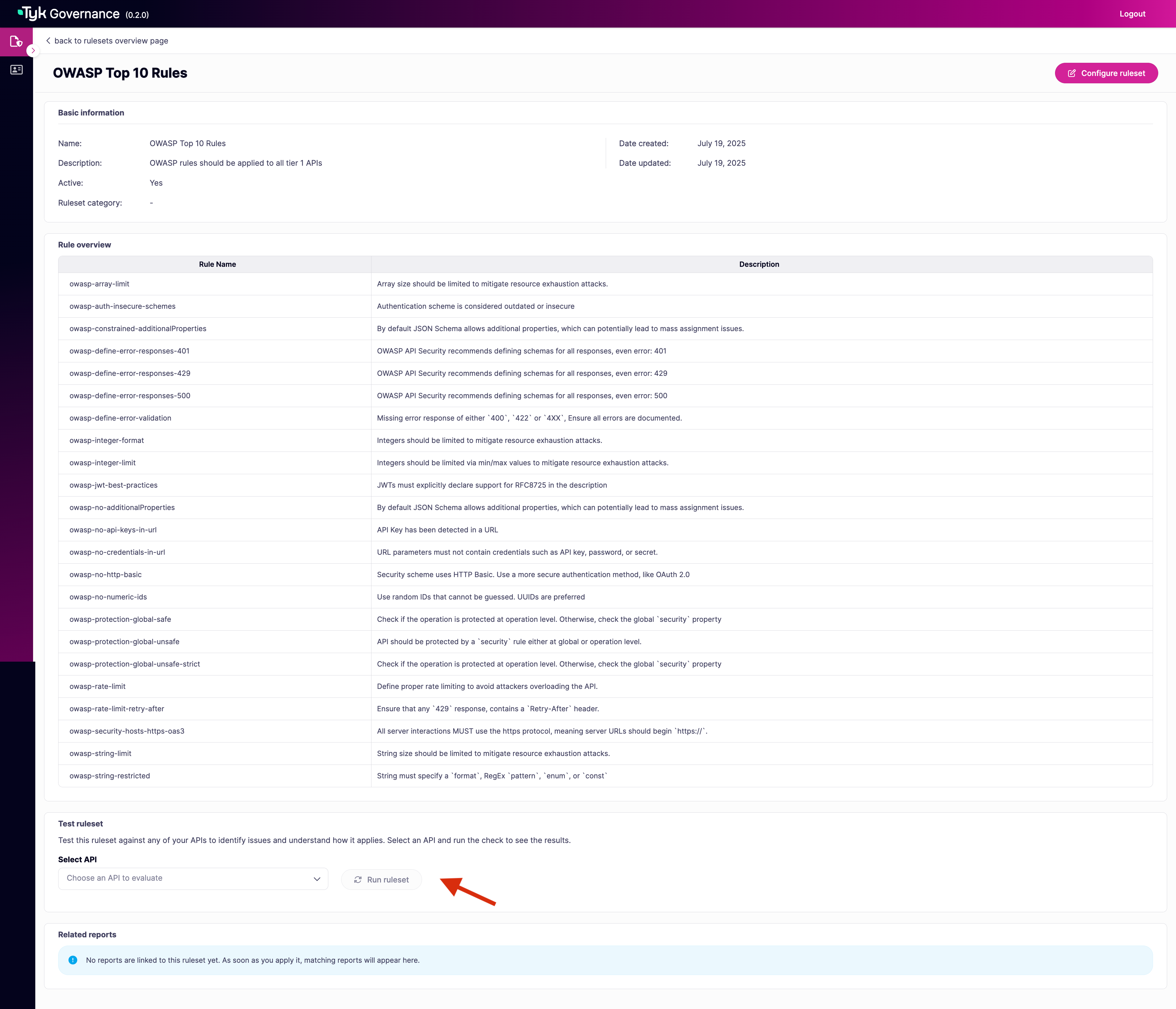 After creating your ruleset, you’ll want to test it against your APIs to ensure it correctly identifies compliance issues. You can test a ruleset through the Governance UI: